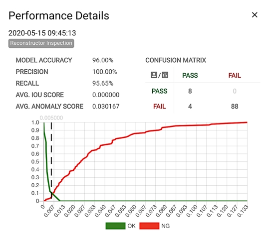 圖10顯示了使用光譜(Hacarus的視覺檢查解決方案)對另外100幅工業(yè)圖像進行評估的結(jié)果。我們獲得了非常積極的結(jié)果,準確率為96%,精確率為100%,繁殖率為95.65%。圖中的異常值是一個內(nèi)部光譜指示器,它的值從0到1,而值越高,異常值就越高。水平軸表示異常值,垂直軸表示總分的累計百分比。紅色的圖表顯示異常程度在0.133附近,涵蓋所有缺陷產(chǎn)品。