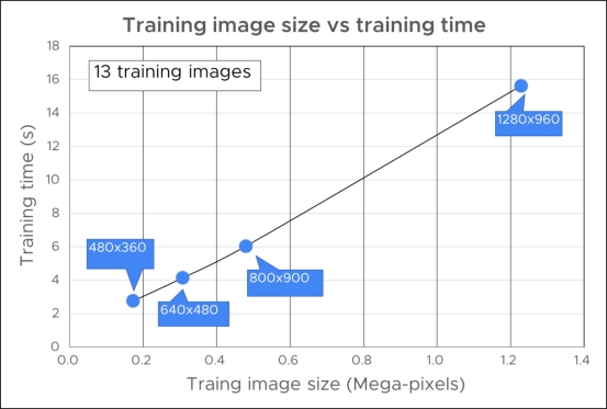 圖8顯示了飛行起重機模式的訓(xùn)練圖像尺寸和訓(xùn)練時間。在13個訓(xùn)練圖像的情況下,1280像素x960像素的大小,訓(xùn)練時間只有大約16秒。訓(xùn)練時間比深入學(xué)習(xí)的時間短得多。隨著圖像尺寸的減小,學(xué)習(xí)時間幾乎以線性的形式減少。