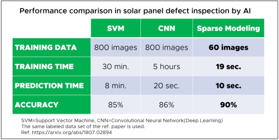 有限的建模可以處理像時間序列這樣的一元數(shù)據(jù)和像圖像這樣的二維數(shù)據(jù)。成像應(yīng)用包括缺陷插值、缺陷檢測(異常檢測)和超分辨率。圖1展示了在太陽能電池板檢測中檢測缺陷圖像任務(wù)的傳統(tǒng)機器學(xué)習(xí)方法與稀疏建模的比較。您可以看到,稀疏建模所需的培訓(xùn)數(shù)據(jù)量(圖像數(shù)量)大大小于深入學(xué)習(xí)的數(shù)據(jù)量。然而,稀疏建模的精度超過90%--訓(xùn)練時間只有19秒。