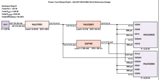 最后,為了給模擬和USB電源電壓以及其他一些核心電壓供電,?MAX38911 利用它精確地將電源電壓從3.3V降至1.8V.這個LDO調(diào)節(jié)器可以提供多達(dá)500mA的負(fù)載電流,足以提供微控制器所需的負(fù)載電流。在低功率模式下,電源轉(zhuǎn)換器消耗大約19.2o的電源電流,使其適合于睡眠模式的操作。