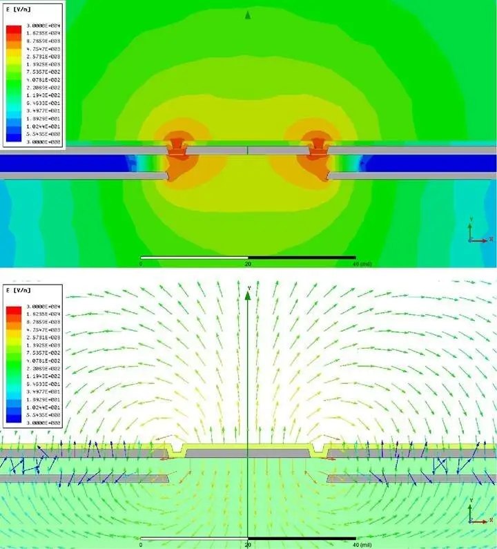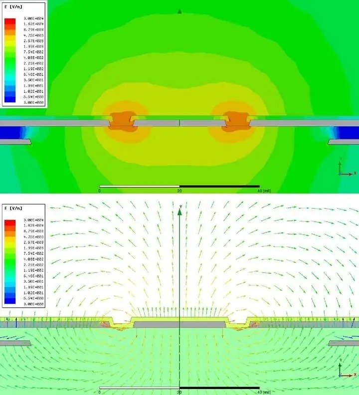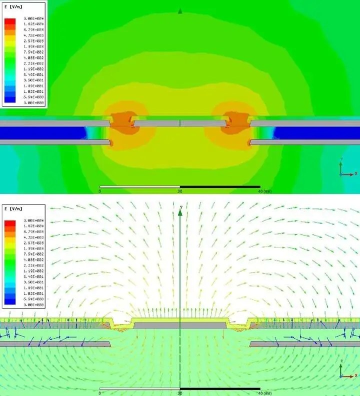 優(yōu)化設(shè)計:5.7 mil 共面間隙,58 mil 第 2 層接地平面間隙:下圖顯示了阻抗優(yōu)化的 5.7 mil 共面間隙和第 2 層接地平面中 58 mil 寬間隙的設(shè)計的 E‐Field。L2 接地平面間隙優(yōu)化掃描顯示,第 2 層接地平面中大于 58 mil 的間隙不會顯著影響阻抗;因此,接地平面切口設(shè)置為 58 mil。