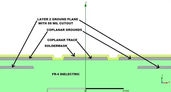 對于多層堆疊上的某些接地共面配置,共面接地參考平面可能是共面跡線下方的兩個或更多個 PCB 層。這需要在位于接地平面參考層上方的那些層上的共面跡線下方設(shè)置一個銅禁區(qū)。試圖直觀地估計該銅禁區(qū)的最佳尺寸充其量是困難的。低估禁區(qū)的尺寸可能會導(dǎo)致不可預(yù)見的電磁場相互作用,而高估禁區(qū)的尺寸可能會導(dǎo)致 PCB 設(shè)計上寶貴的布線面積不必要地損失。