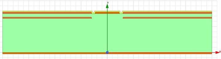 根據(jù)此輸入,我們的客戶最初使用的傳輸線計算工具確定共面間隙為 3 mil。第 2 層接地平面上有一個切口。PCB 設(shè)計師將此切口的寬度與第 1 層共面接地浮雕的寬度相匹配,因此第 2 層平面上的切口寬度為 30 mil,如上圖所示。