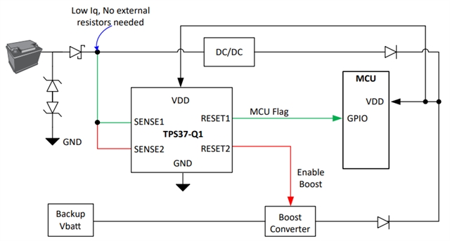 圖1:使用TPS37-Q1 直接監(jiān)控 12V/48V 電池電壓