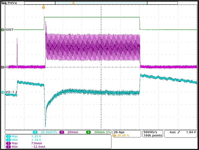 圖 2 :TPS62843 的負(fù)載瞬態(tài)特性(V OUT = 1.2V ,I OUT_MIN = 0A至I OUT_MAX = 300mA)