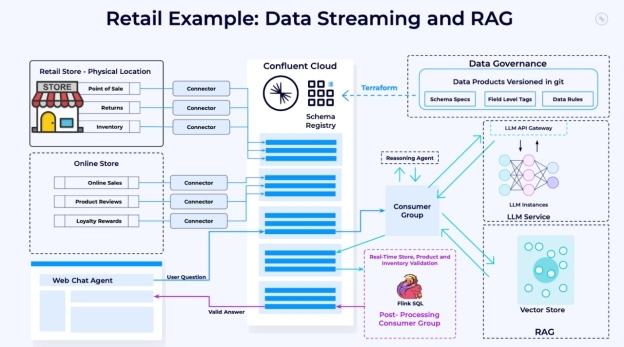 事件驅動的體系結構在這里是有益的,因為它是一種有效的方法,可以實時集成來自整個企業(yè)的不同數(shù)據(jù)源,提供可靠和可信的信息。相比之下,使用級聯(lián)批處理操作的更為傳統(tǒng)的ETL(提取、轉換、負載)管道不太適合使用,因為當信息到達LLP時,它通常會失效。事件驅動的體系結構確保在對操作數(shù)據(jù)存儲進行更改時,這些更改會被轉移到將用于上下文化提示的向量存儲中。將這些數(shù)據(jù)組織成流數(shù)據(jù)產(chǎn)品也有助于可重用性,因此這些數(shù)據(jù)轉換可以被看作是可組合的組件,可以支持多個使用LLP的應用程序的數(shù)據(jù)增強。