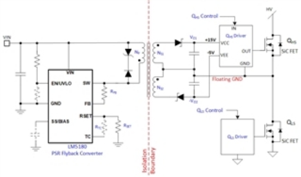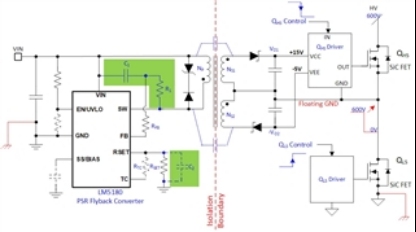 圖 1顯示了牽引逆變器應(yīng)用中使用TI LM5180轉(zhuǎn)換器的PSR反激式轉(zhuǎn)換器拓?fù)?。所?PSR 反激器件(例如LM5181、LM25180、LM25183和LM25184轉(zhuǎn)換器以及 LM5185 控制器)均與LM5180共享通用架構(gòu)。這些產(chǎn)品之間的主要區(qū)別在于它們可以處理的功率大小。