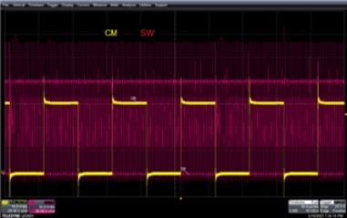 圖 3 顯示了受 CMTI 影響的正常 PSR 反激的典型波形。這是使用標(biāo)準(zhǔn)LM5180EVM-S05 評(píng)估板 (EVM) 捕獲的。黃色波形是 SiC 橋臂的 CMT。紅色波形是 PSR 反激式 SW 引腳上的電壓。