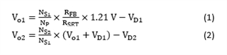 這里,1.21V是轉(zhuǎn)換器IC的參考電壓。 N P、N S1、N S2分別是相應(yīng)變壓器繞組的匝數(shù)。 R FB和R SET分別是輸出電壓檢測(cè)電阻和調(diào)節(jié)設(shè)置電阻。 V D1和V D2分別是兩個(gè)輸出二極管的正向壓降。