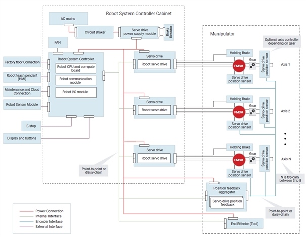 集中控制架構(gòu)可以滿足高功率自動化系統(tǒng)的性能和效率設(shè)計要求,例如具有大有效負載的工業(yè)機器人,但它們也需要添加電纜。這些電線不僅增加了成本,而且還會磨損并需要維護。