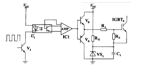 說明:由于IGBT是高速器件,所選用的光耦必須是小延時(shí)的高速型光耦,由PWM控制器輸出的方波信號(hào)加在三極管V1的基極,V1驅(qū)動(dòng)光耦將脈沖傳遞至整形放大電路IC1,經(jīng)IC1放大后驅(qū)動(dòng)由V2、V3組成的對(duì)管(V2、V3應(yīng)選擇β》100的開關(guān)管)。對(duì)管的輸出經(jīng)電阻R1驅(qū)動(dòng)IGBT4,R3為柵射結(jié)保護(hù)電阻,R2與穩(wěn)壓管VS1構(gòu)成負(fù)偏壓產(chǎn)生電路,VS1通常選用1W/5.1V的穩(wěn)壓管。此電路的特點(diǎn)是只用1組供電就能輸出正負(fù)驅(qū)動(dòng)脈沖,使電路比較簡(jiǎn)潔。