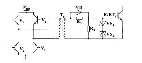 說明:V1~V4組成脈沖變壓器一次側(cè)驅(qū)動(dòng)電路,通過控制V1、V4和V2、V3的輪流導(dǎo)通,將驅(qū)動(dòng)脈沖加至變壓器的一次側(cè),二次側(cè)通過電阻R1與IGBT5柵極相連,R1、R2防止IGBT5柵極開路并提供充放電回路,R1上并聯(lián)的二極管為加速二極管,用以提高IGBT5的開關(guān)速度,穩(wěn)壓二極管VS1、VS2的作用是限制加在IGBT5g-e端的電壓,避免過高的柵射電壓擊穿柵極。柵射電壓一般不應(yīng)超過20V。