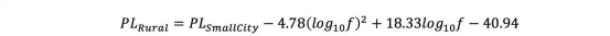 不幸的是,現(xiàn)實(shí)世界中的范圍受到許多其他因素的影響,例如各種障礙物的反射和吸收?,F(xiàn)實(shí)世界中有各種傳播模型,大多數(shù)基于經(jīng)驗(yàn)數(shù)據(jù)集。Okumura -Hata 模型是一個(gè)不錯(cuò)的選擇,它為各種環(huán)境(城市、郊區(qū)、農(nóng)村)和各種天線高度提供了選項(xiàng)。在農(nóng)村或開(kāi)放環(huán)境中,路徑損耗公式為(圖 5):