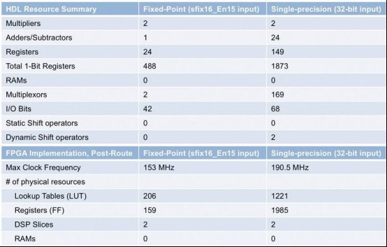 當(dāng)您比較從浮點(diǎn)和固定點(diǎn)實(shí)現(xiàn)中獲得的結(jié)果時(shí),記住浮點(diǎn)計(jì)算比簡單的固定點(diǎn)算法需要更多的操作。使用單精度將導(dǎo)致在部署到FPGA或ASIC時(shí)使用更高的物理資源。如果電路區(qū)域是一個(gè)問題,那么您將需要交換更高的精度和資源使用。您也可以使用浮點(diǎn)和固定點(diǎn)的組合減少面積,同時(shí)保持單精度,以實(shí)現(xiàn)高動(dòng)態(tài)范圍的數(shù)字密集計(jì)算。
