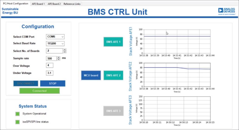 系統(tǒng)標簽頁:這是應用程序的主登陸頁面(圖4)。用戶可在此建立串行PC通信,選擇連接的AFE板數(shù)量,以及確定用于過壓和欠壓檢查的測量間隔和閾值。點擊連接后,用戶即可開始測量。兩個系統(tǒng)狀態(tài)燈都變成綠色(如圖4所示)時,會根據(jù)用戶輸入的電路板數(shù)量而顯示相應的測量標簽頁。
