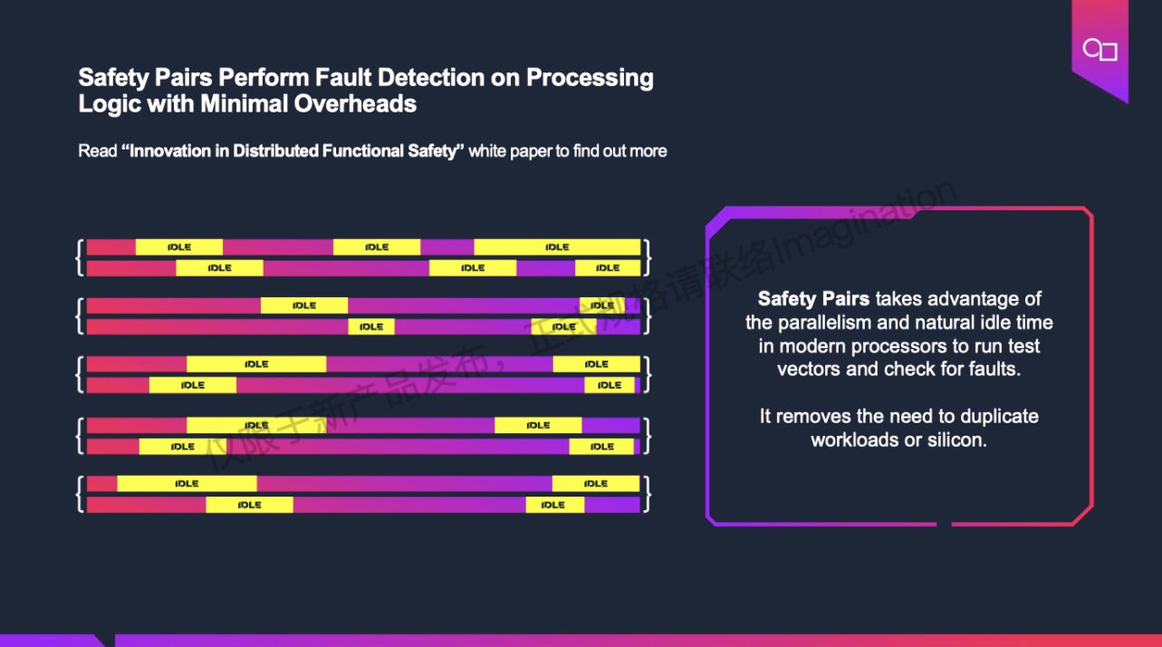 這種創(chuàng)新的技術(shù)叫做Safety Pairs,這是一種分布式功能安全機制,是Imagination的最新專利技術(shù),它通過利用現(xiàn)代處理器中的并行性和自然空閑時間來實現(xiàn)故障檢測,且無需對工作負(fù)載或硬件進(jìn)行重復(fù)處理,從而減少了開銷。