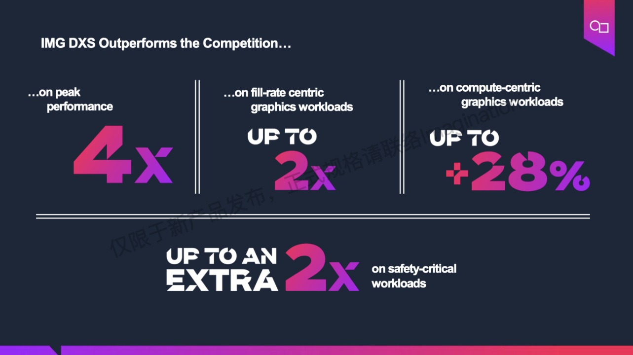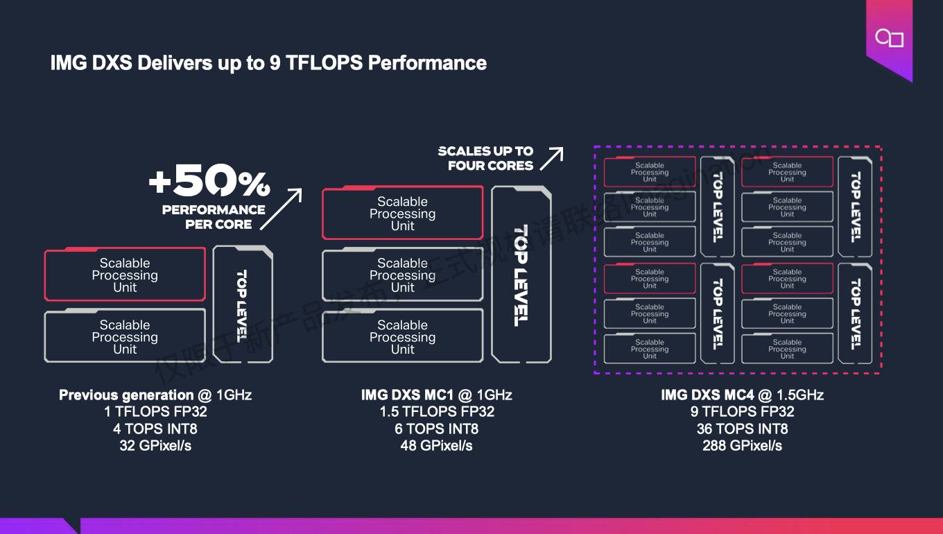 最新的IMG DXS GPU在圖形處理和計算性能上的強大表現(xiàn)。首先,相比上一代產(chǎn)品,DXS GPU的每核心性能提升了50%,顯著提高了圖形和計算任務(wù)的處理能力。此外,DXS GPU具有極強的可擴展性,支持?jǐn)U展至四個核心,最大化系統(tǒng)的處理能力。在1GHz時,DXS MC1能夠達(dá)到1.5 TFLOPS的浮點性能,并在INT8計算中實現(xiàn)6 TOPS(每秒萬億次操作),圖形像素填充率達(dá)到48 GPixels/s。而當(dāng)頻率提升至1.5GHz,DXS MC4的整體性能能夠達(dá)到9 TFLOPS的浮點性能、36 TOPS的INT8性能以及288 GPixels/s的像素填充率。通過這些優(yōu)化,DXS GPU在計算性能、圖形處理能力和可擴展性方面都達(dá)到了一個新的高度。