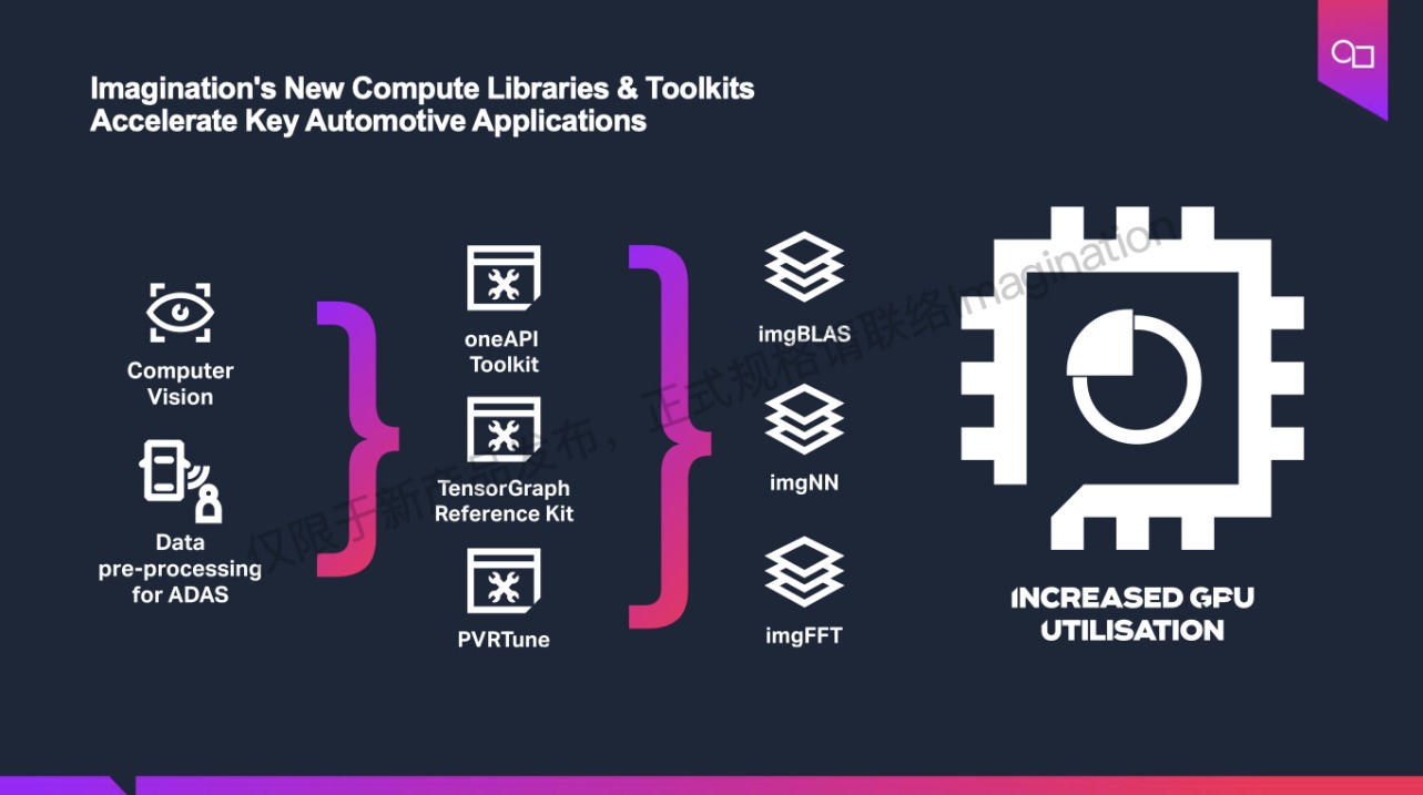 因此,DXS GPU有著天然的開發(fā)生態(tài)優(yōu)勢,而Imagination也進(jìn)一步在硬件架構(gòu)優(yōu)化創(chuàng)新的基礎(chǔ)上,提供了最新的計算庫(compute library)和工具包(Toolkit),來幫助開發(fā)者加速關(guān)鍵的汽車應(yīng)用——特別是ADAS(高級駕駛輔助系統(tǒng))和計算機視覺相關(guān)的任務(wù)。