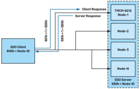 圖2顯示了多節(jié)點(diǎn)網(wǎng)絡(luò)中SDO協(xié)議的基于客戶端-服務(wù)器的配置。每個(gè)節(jié)點(diǎn)都被分配一個(gè)通道,通過(guò)該通道可以與客戶端進(jìn)行通信。在這種情況下,Trinamic TMCM-6212六步進(jìn)電機(jī)驅(qū)動(dòng)器/控制器充當(dāng)服務(wù)器,而連接的PC充當(dāng)客戶端,發(fā)起與特定節(jié)點(diǎn)(本例中為NODE-1)的讀/寫事務(wù)。雖然所有節(jié)點(diǎn)都會(huì)收到SDO客戶端消息,但只有目標(biāo)節(jié)點(diǎn)會(huì)響應(yīng),而其他服務(wù)器會(huì)忽略客戶端請(qǐng)求。