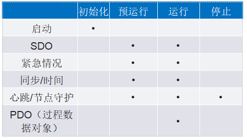表1列出了不同通信狀態(tài)下使用的所有通信對(duì)象的組合。設(shè)備上電或復(fù)位后進(jìn)入初始化狀態(tài)時(shí),會(huì)產(chǎn)生啟動(dòng)消息。然后,設(shè)備轉(zhuǎn)換到預(yù)運(yùn)行狀態(tài),準(zhǔn)備好執(zhí)行期望的操作。在預(yù)運(yùn)行狀態(tài)下,網(wǎng)絡(luò)中的所有節(jié)點(diǎn)可以傳輸與SDO、心跳/節(jié)點(diǎn)守護(hù)、緊急情況和時(shí)間/同步相關(guān)的所有對(duì)象。在運(yùn)行狀態(tài)下,除了預(yù)運(yùn)行狀態(tài)下可用的所有對(duì)象之外,還可以映射PDO對(duì)象。最后,在停止?fàn)顟B(tài)下,設(shè)備會(huì)禁用所有SDO和PDO對(duì)象的通信,僅允許執(zhí)行NMT命令。