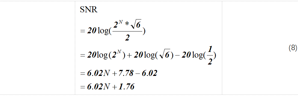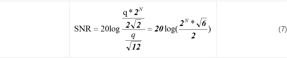 那么到目前為止,我們知道了信號(hào)的有效值(RMS),即公式(6),也知道了ADC量化噪聲的有效值(RMS),即公式(2)。把公式(6)和公式(2)帶入公式(4)得到公式(7):