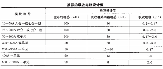 下表給出了針對(duì)H系列IGBT推薦的吸收電路設(shè)計(jì)值,使用下表的兩個(gè)設(shè)定條件是: