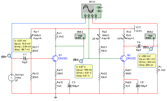 如下圖所示,該電路由兩個(gè)基本共射極放大電路構(gòu)成,其中Q1的集電極輸出第一級(jí)信號(hào),直接被Q2的基極接收,放大后從Q2集電極輸出: