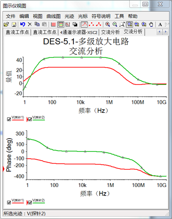多級(jí)放大電路的幅頻特性和相頻特性如下圖,紅色曲線為第一級(jí)放大電路的頻率特性,綠色曲線為多級(jí)放大電路的頻率特性。
