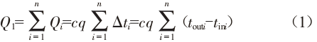 式中:Q1為試驗裝置向冷卻水的總放熱量;Qi為試驗裝置向冷卻水的瞬時放熱量;Q2為冷卻水的總吸熱量;c為水的比熱容,c=4186.8 J/(kg.℃)[3];q為冷卻裝置的冷卻水質(zhì)量流量;Δti為試驗裝置的冷卻水進、出水溫差;touti為試驗裝置的冷卻水出水瞬時溫度;tini為試驗裝置的冷卻水進水瞬時溫度;ρ為水的密度;V為冷卻水系統(tǒng)的水容量;Δt為冷卻水系統(tǒng)水的溫升。