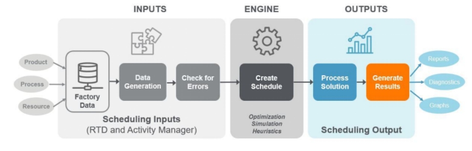 通常,排程解決方案需要提取工廠數(shù)據(jù),并將其轉(zhuǎn)換或轉(zhuǎn)化為解決方案輸入數(shù)據(jù)。然后,排程引擎(無(wú)論采用何種方法)根據(jù)不同的考慮因素和目標(biāo)應(yīng)用邏輯,生成排程輸出數(shù)據(jù)。然后,這些數(shù)據(jù)經(jīng)過(guò)處理,以用戶友好的可視化和分析格式發(fā)布成計(jì)劃,供最終用戶使用。這個(gè)過(guò)程如下圖1所示。
