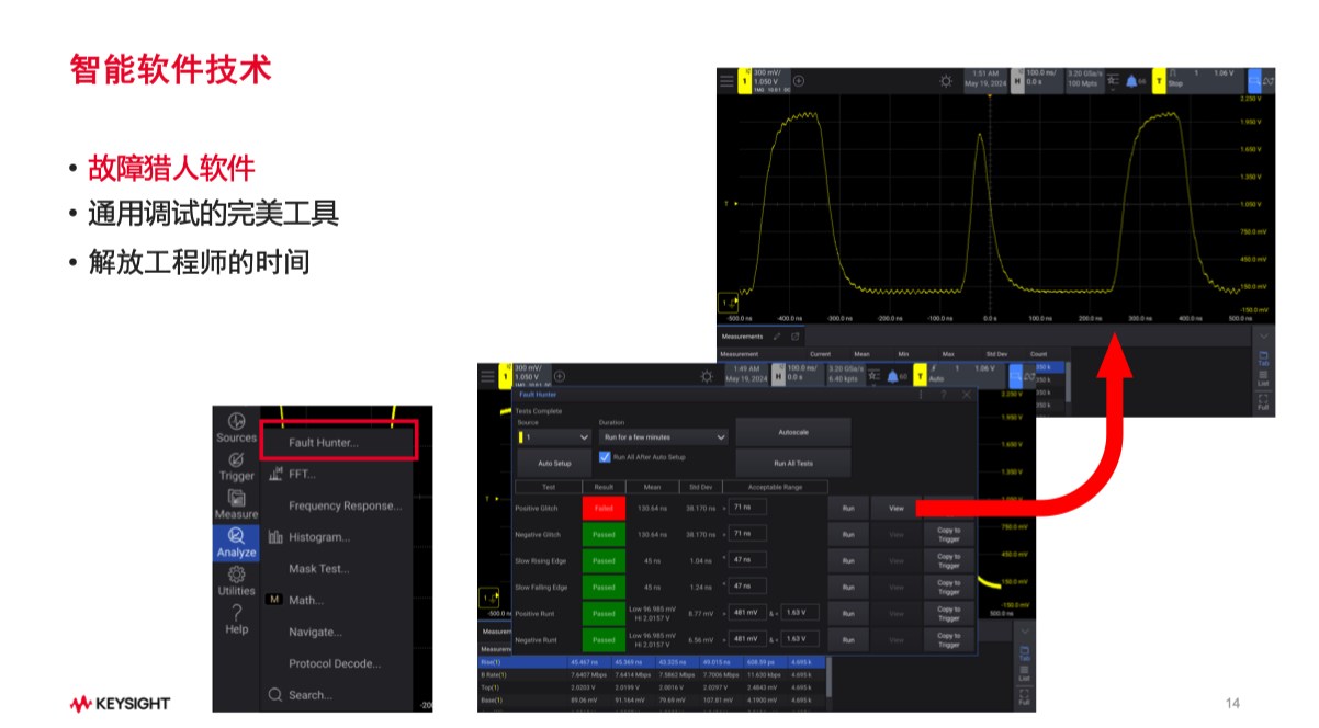 雖然InfiniiVisionHD3系列采用了嵌入式系統(tǒng),但它將Windows系統(tǒng)示波器中很多好的功能和軟件,實(shí)現(xiàn)了遷移。例如AI智能測(cè)試軟件“故障獵人”,該軟件可以讓示波器長時(shí)間地自動(dòng)學(xué)習(xí)用戶的波形,捕捉其中的波形錯(cuò)誤,從而根據(jù)用戶波形的狀態(tài)自動(dòng)設(shè)置合適的觸發(fā)條件,實(shí)現(xiàn)異常信號(hào)的觸發(fā)和自動(dòng)記錄。
