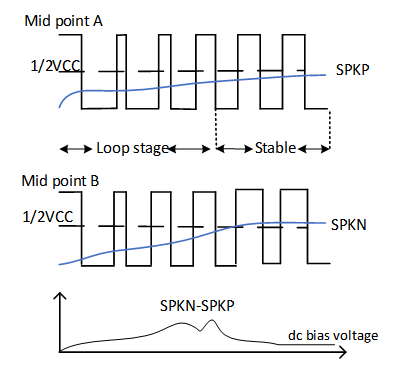 因此,揚(yáng)聲器端子SPKP和SPKN之間的電壓水平相同,沒有電壓偏差導(dǎo)致電流流入揚(yáng)聲器的線圈,當(dāng)然也不會(huì)有點(diǎn)擊或爆裂噪聲。現(xiàn)在我們來看實(shí)際的模擬電路:元件的公差、參考點(diǎn)的位置不同、驅(qū)動(dòng)器的時(shí)間方案差異、PCB走線因素等。所有這些差異導(dǎo)致A點(diǎn)的PWM與B點(diǎn)的PWM不匹配,即使在相同的初始條件下啟動(dòng)也是如此。圖4是功率放大器從靜音到取消靜音時(shí)的實(shí)際波形。調(diào)制器開始工作并將占空比從小調(diào)節(jié)到50%,這是功率放大器在啟動(dòng)階段的循環(huán)階段,PWM的目標(biāo)是在功率放大器環(huán)路穩(wěn)定后保持輸出平均水平等于1/2VCC。