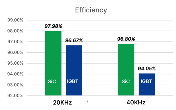 我們使用相近電流規(guī)格的IGBT和SiC MOSEFT做了效率仿真,在最大功率下,SiC 也可以有效提高系統(tǒng)效率,尤其在高頻應(yīng)用中更加明顯。