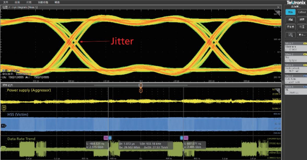 PSIJ(Power Supply Induced Jitter)是指由電源因素導(dǎo)致的信號中抖動。這種抖動可能導(dǎo)致信號失真、數(shù)據(jù)傳輸錯誤,甚至影響整個系統(tǒng)的可靠性和性能。如圖1示,顯示一高速總線信號(HSS)受到其供電電源(Power Supply)的影響,其高速信號速率變化的規(guī)律與Power Supply存在一定的關(guān)聯(lián)性,眼圖分析也存在一定的抖動(Jitter)。