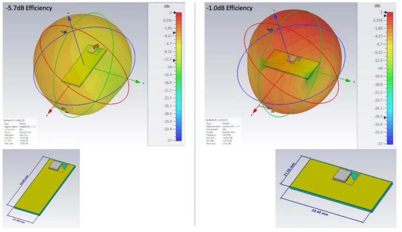 左圖:SiP模塊布局在狹窄PCB的短邊上,會(huì)降低天線效率。右圖:SiP模塊布局在狹窄PCB的長(zhǎng)邊上,可提供卓越的天線效率。