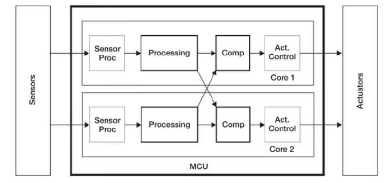 目前市場(chǎng)上主要的功能安全解決方案有兩種:應(yīng)用最廣泛的一種被稱為“鎖步(lockstep)”解決方案,這是一種比較簡(jiǎn)單粗暴的方法,在汽車CPU中被廣泛使用。該方法就是用兩個(gè)處理器內(nèi)核等同樣的邏輯來執(zhí)行一個(gè)程序以實(shí)現(xiàn)同樣的一個(gè)功能,由它們同時(shí)執(zhí)行并在執(zhí)行完之后來比較這個(gè)結(jié)果,看看這兩個(gè)結(jié)果是否一致。在受到高溫或者高濕影響時(shí),如果這兩個(gè)內(nèi)核得到的兩個(gè)結(jié)果是一致的話,那證明這兩塊邏輯是運(yùn)行正確的,有關(guān)計(jì)算和控制還能正確地執(zhí)行。
