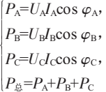 式中:UA、UB、UC分別為A、B、C三相電壓;IA、IB、IC分別為A、B、C三相電流;φA、φB、φC分別為A、B、C三相電流電壓夾角。