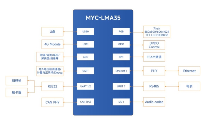 MYC-LMA35核心板在充電樁的應用中展現(xiàn)了其強大的技術(shù)優(yōu)勢。MA35D1處理器配備原生17路UART接口,能夠利用UART接口實現(xiàn)內(nèi)外電壓檢測、計量電壓采樣和調(diào)試,也可以將UART接口根據(jù)需求轉(zhuǎn)換為RS232、RS485串口通信方式,連接刷卡器、電表和掃碼槍,使得其與電動車及其他設備的通信更加高效和靈活;核心板支持ADC,能夠監(jiān)測控制電壓電流和溫度,確保充電過程安全與高效;USB接口可連接U盤,實現(xiàn)數(shù)據(jù)存儲和更新;兩路千兆以太網(wǎng),可以實現(xiàn)高速數(shù)據(jù)傳輸,滿足充電樁實時監(jiān)控和遠程管理的需求;支持SPI和I2C接口,為外部傳感器和模塊的連接提供了便利;I2S、RGB等多媒體接口,幫助實現(xiàn)人機交互的界面顯示和操作輸入。MYC-LMA35核心板支持的多種拓展外設,使得其成為充電樁解決方案的理想選擇,推動智能充電技術(shù)的發(fā)展。