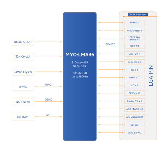 米爾電子發(fā)布了基于新唐MA35D1處理器設計的MYC-LMA35核心板,MA35D1處理器集成了雙核Cortex-A35和Cortex-M4,原生17路UART和4路CAN FD接口,可實現(xiàn)多種設備的高效互聯(lián)并滿足通信需求,此外,MYC-LMA35核心板還提供了豐富的外設資源:RGMII/USB/SDIO/I2S/I2C/EADC/EPWM/SPI等,豐富的外設資源使得MYC-LMA35核心板能夠廣泛應用于串口服務器、工業(yè)網(wǎng)關、新能源充電樁、振動監(jiān)測、工程機械控制器、運動控制器和電力DTU等場景。