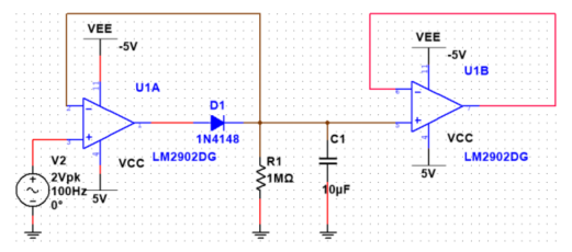 峰值檢波電路是對輸入信號幅值的最大值進行檢測,其工作原理是:當輸入電壓幅度大于二極管正向電壓時,二極管導通,輸出電壓加在電容C1上,電容兩端充電完畢,當輸入電壓幅值低于先前輸入電壓幅值時,二極管處于反偏截止狀態(tài),此時,電容兩端的電壓基本保持不變;若再輸入信號,輸入電壓幅度必須高于此時電容兩端的電壓(即加在二極管的正向電壓),二極管才能導通。