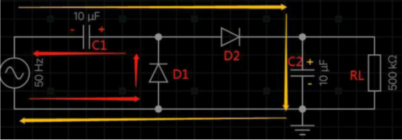 電源負半周時,二極管D1導通,D2截止,電流從電源下端流出經(jīng)過D1, C1回到電源,因此電容C1右正左負,如下圖中紅色箭頭。電源正半周時,電容C1上的電壓疊加電源電壓,使二極管D2導通,二極管D1截止,電容C2上正下負,峰值電壓可達2倍電源的峰值電壓,即實現(xiàn)二倍壓,該半周期時電流走向如下圖中桔色箭頭所示。
