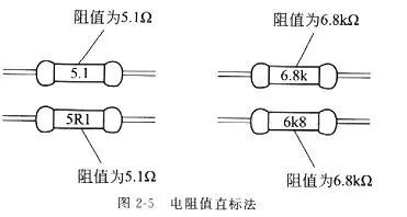 一是直標(biāo)法,行將電pn值直接印刷在電阻器上。例如,在5.1Ω的電阻器上印有“5.1”或“5R1”字樣,在6.8kΩ的電阻器有“6.8k”或“6k8”字樣,如圖2-5所示。
