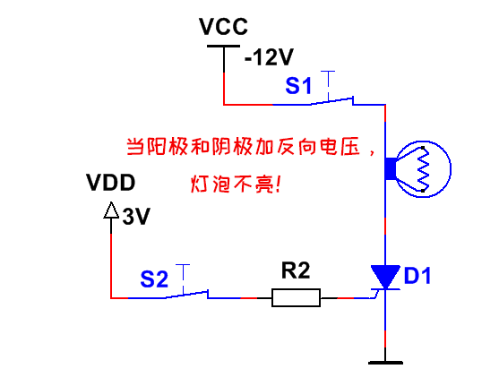 如下圖所示,當陽極和陰極加反向電壓,晶閘管不會導通,燈泡不亮!