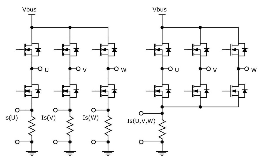 圖 3. 使用三分流器(左)和單分流器(右)方法監(jiān)測 BLDC 電機電流。