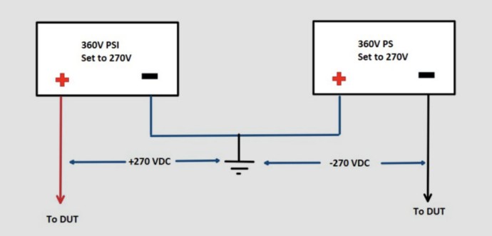 在開始項(xiàng)目之前,請確保電源具有相似的額定值,然后再將它們串聯(lián)起來。必須將兩個(gè)相似的電源串聯(lián)起來,才能從 400 V 單元產(chǎn)生 800 V 的供電(圖 1)。500 V 單元最接近所需的 400 V,例如可編程雙向直流電源,其輸出可以設(shè)置為 400 V,如圖 1 所示。