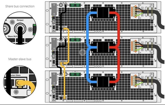 為此,制造商采用了一種稱為“主輔”的技術(shù),并配有專用的負(fù)載共享總線。在此模式下,當(dāng)同一系列的多個(gè)電源型號通過“主輔”總線和共享總線連接時(shí),整個(gè)多設(shè)備系統(tǒng)將作為單個(gè)設(shè)備運(yùn)行。使用“主輔”總線,系統(tǒng)數(shù)據(jù)(例如總功率和總電流)將被收集并顯示在主設(shè)備上。輔助設(shè)備的警告和警報(bào)會清晰地顯示在顯示屏上。共享總線為單個(gè)設(shè)備提供均勻的負(fù)載分配。