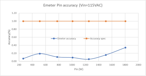 圖 7 1.8 kW 低壓線的電子表測試結(jié)果,Vin 設置為 115 VAC,顯示電子表精度遠高于 M-CRPS 精度規(guī)格。