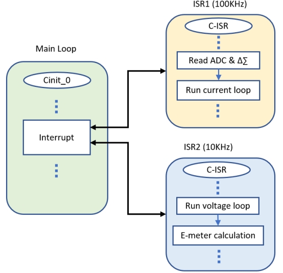 圖 6固件結(jié)構(gòu)由三個循環(huán)組成:用于低時間關鍵任務的主循環(huán);用于 ADC、delta-sigma 數(shù)據(jù)讀取和電流環(huán)路控制的 100 kHz IRS1 循環(huán);以及用于電壓環(huán)路控制和電子儀表計算的 10 kHz ISR2 循環(huán)。