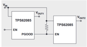 圖 3. 在某些情況下,一種簡(jiǎn)單但足夠的排序方法是讓一個(gè)穩(wěn)壓器的電源良好 (PG) 輸出按順序成為下一個(gè)穩(wěn)壓器的啟用 (EN) 輸入;這里,兩個(gè)按順序排列的德州儀器 TPS62085 降壓 (buck) 穩(wěn)壓器為直流電源軌 V OUT1和 V OUT2供電。
