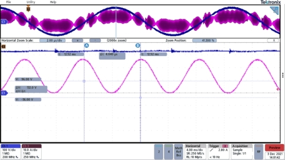 圖 5以洋紅色顯示了流過 L P1 的交流線電流的時域波形,以藍(lán)色顯示了交流輸入電壓。請注意,電流具有明顯的 240 kHz 正弦波,峰峰值幅度為 28 A。該正弦波是三角 PFC 電流流過圖 4 中紅色元件產(chǎn)生的非預(yù)期放大器的直接結(jié)果。